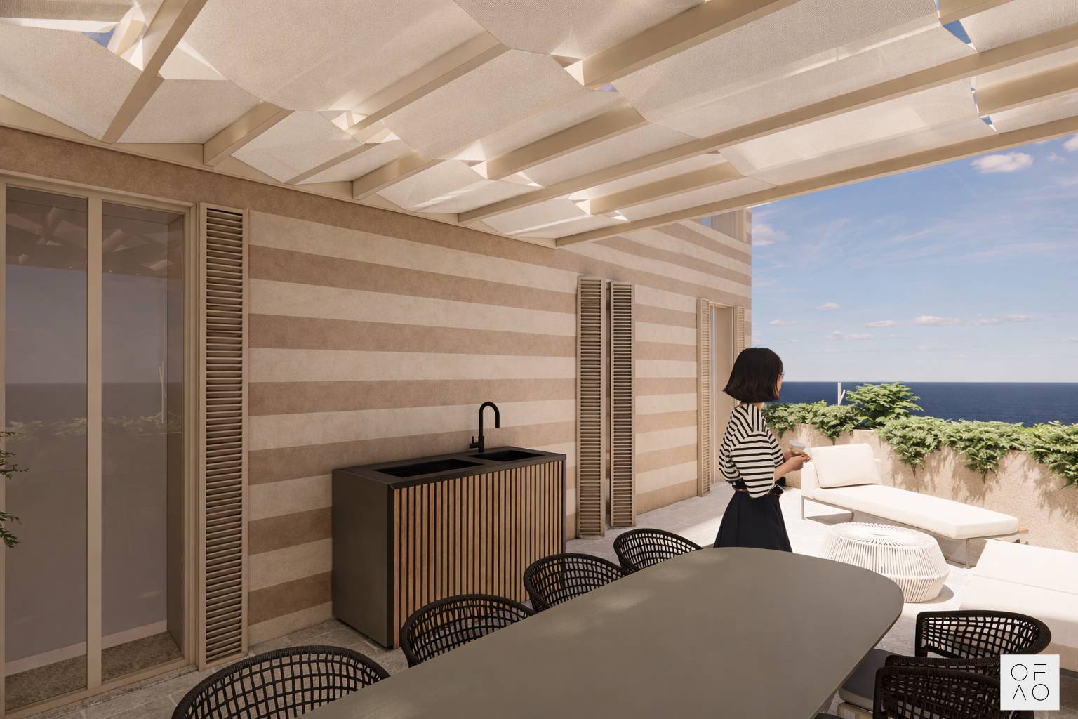 Il progetto ha lo scopo di creare una continua connessione degli interni con lo spazio esterno, mantenendo allo stesso tempo elevati livelli di privacy grazie all'uso del verde e di elementi ombreggianti.