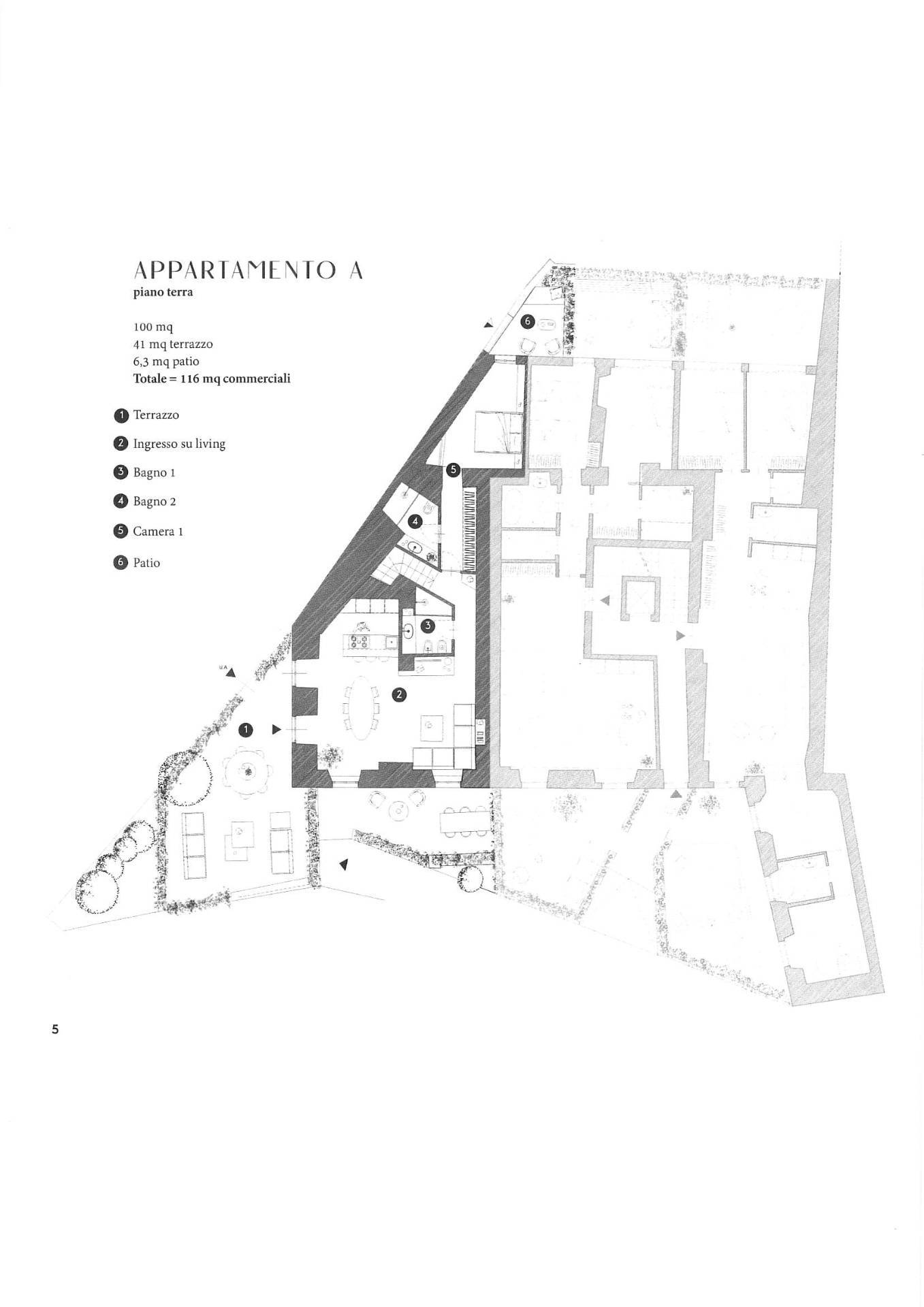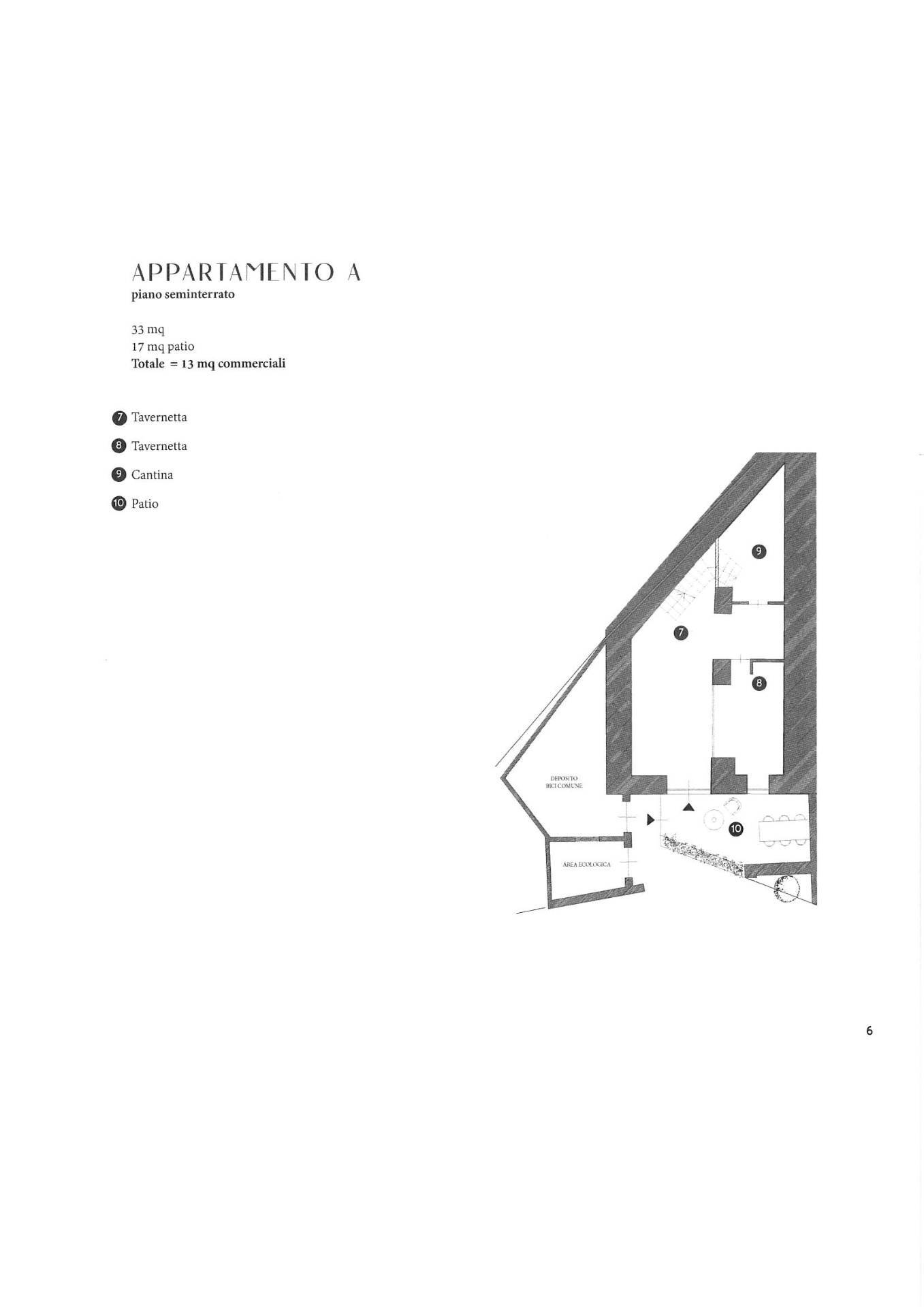 Appartamento "A " PIANO TERRA composto da ingresso living su soggiorno con cucina a vista, camera da letto, doppi servizi, patio e terrazzo; al piano seminterrato due locali uso tavernetta, cantina ed ulteriore patio.