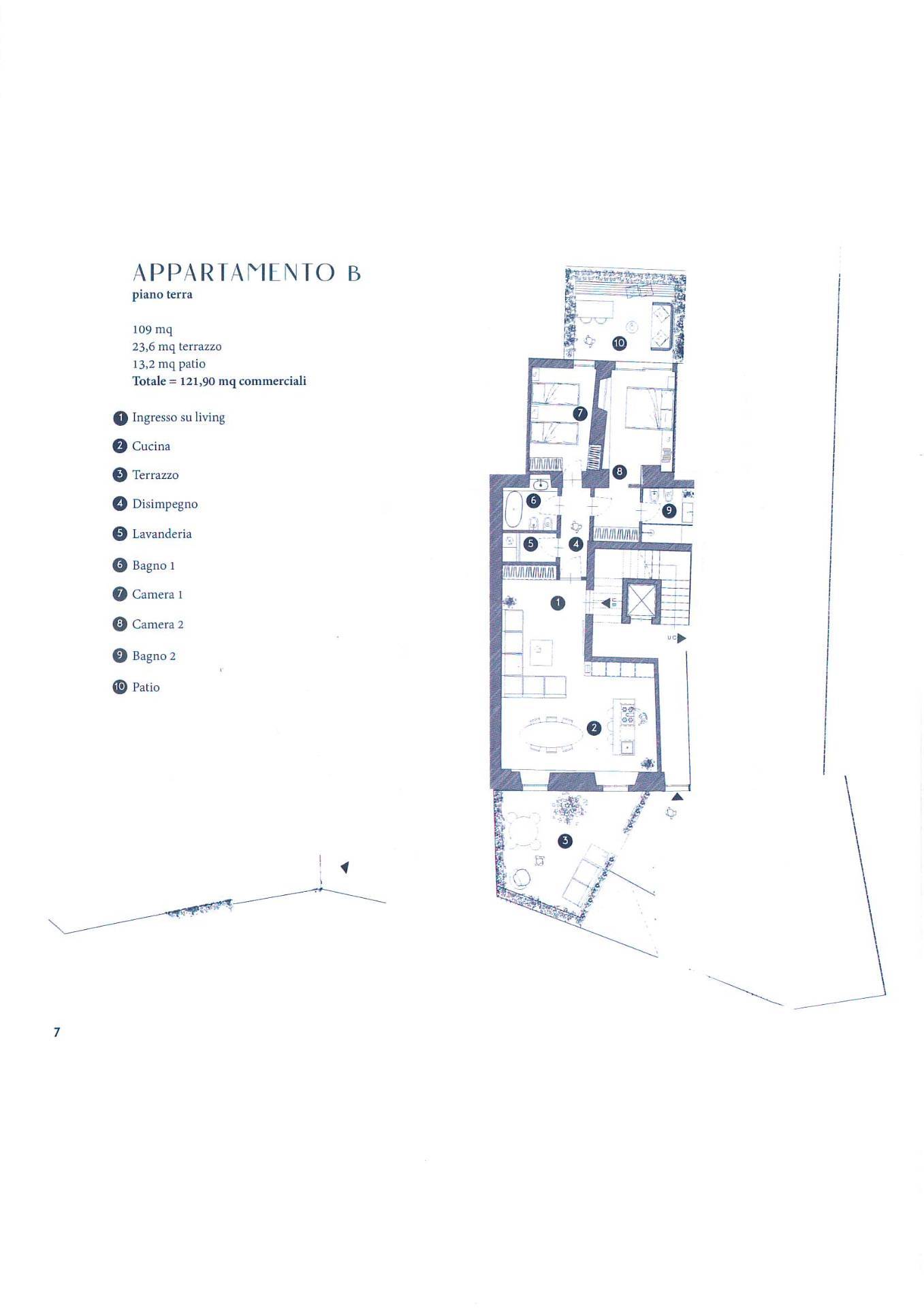 Appartamento "B " PIANO TERRA composto da ingresso living su soggiorno con cucina a vista, due camere da letto, doppi servizi, disimpegno, lavanderia, terrazzo, patio e giardino privato.