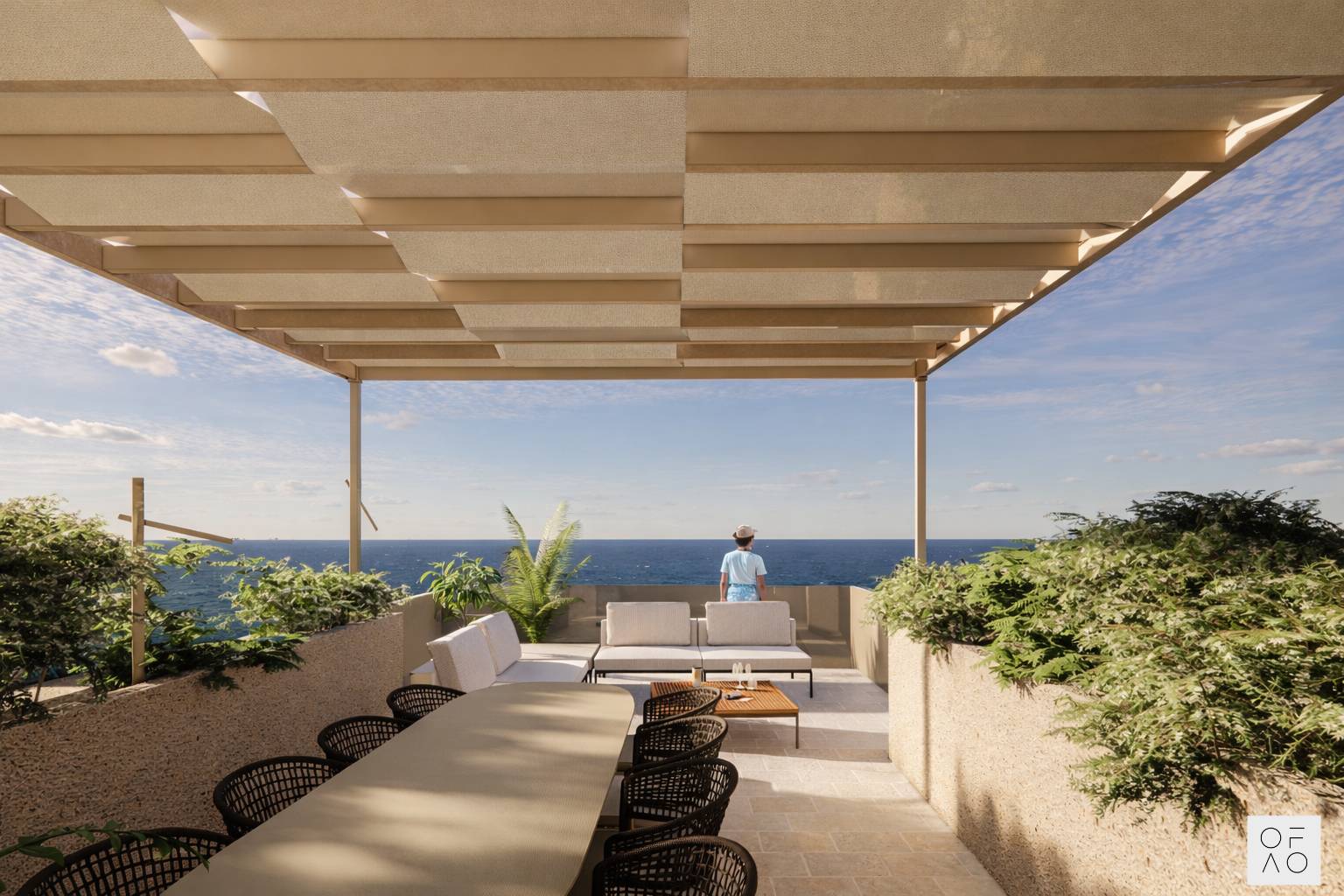 Il progetto ha lo scopo di creare una continua connessione degli interni con lo spazio esterno, mantenendo allo stesso tempo elevati livelli di privacy grazie all'uso del verde e di elementi ombreggianti.